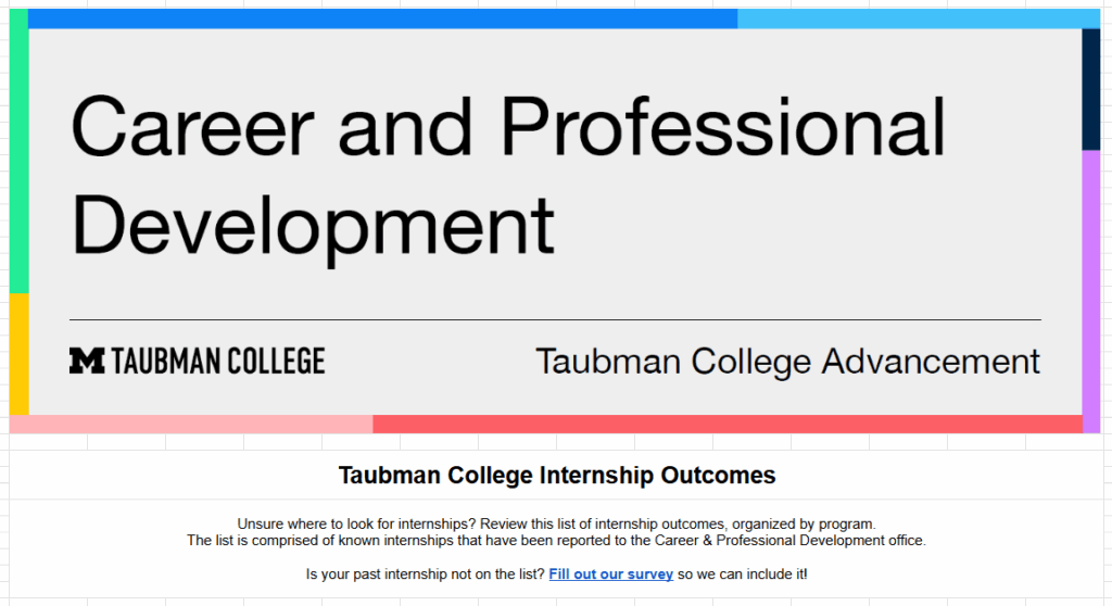 In addition to surveying our alumni, we survey current students via our annual Fall Survey. The information collected is used to produce an Internship Outcomes List. This report outlines internship outcomes over a three-year period, organized by program. You can access these reports through Google Drive using your U-M credentials by clicking the image below.